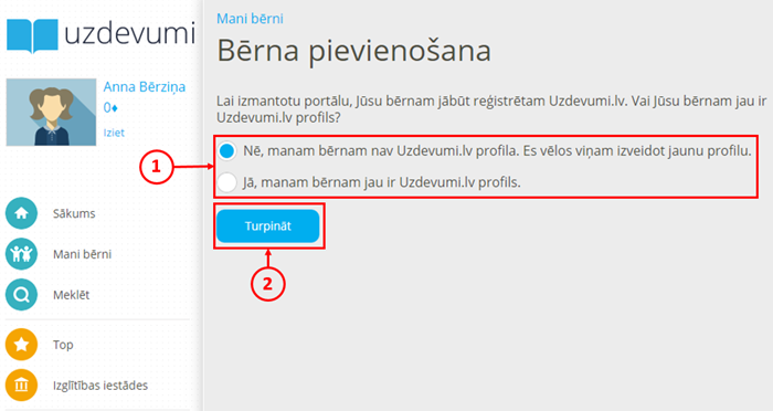 - pie izvēles iespējām (1) izvēlieties "Nē, manam bērnam nav Uzdevumi.lv profila. Es vēlos viņam izveidot jaunu profilu.";