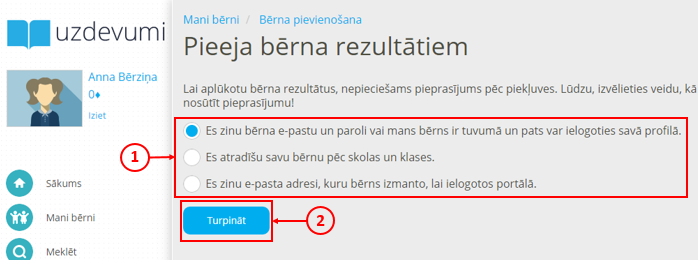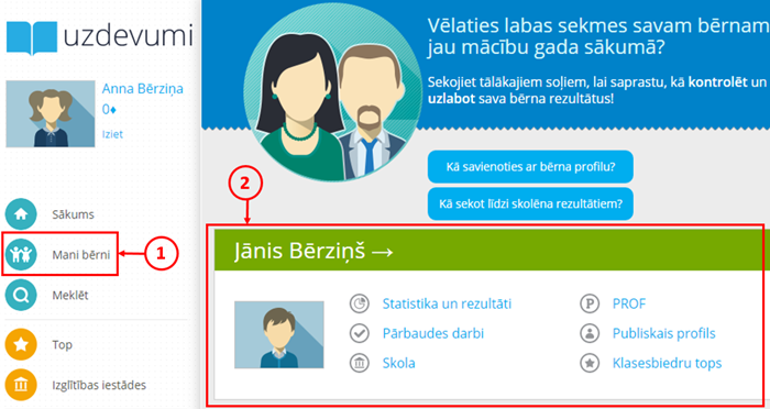 Tiklīdz Jūs veiksmīgi pievienojat bērnu savam profilam, Uzdevumi.lv sākumlapā parādās šī bērna vizītkarte (2), kas dod iespēju sekot līdzi viņa aktivitātei un sasniegumiem portālā.