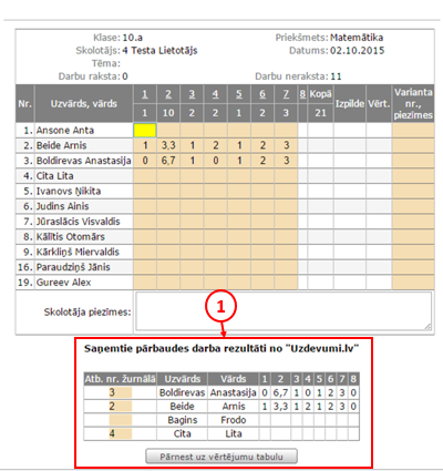Šajā solī būs redzami skolēni un viņu rezultāti Uzdevumi.lv pārbaudes darbā (1). Lai pārnestu šīs atzīmes uz E-klases žurnālu, jāklikšķina uz pogas "Pārnest uz vērtējumu tabulu". Pēc tam atzīmes parādīsies E-klases žurnālā. Pirms iziešanas no sistēmas, jānoklikšķina uz "Saglabāt".