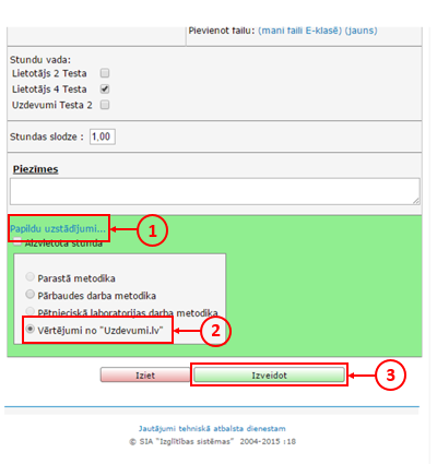 Iespēju izvēlēties vērtējumus no Uzdevumi.lv būs iespējams redzēt tikai tad, kad skolotājs noklikšķinās uz izvēles "Papildus uzstādījumi..." (1). Kad tas izdarīts, jāieklikšķina pie "Vērtējumi no Uzdevumi.lv" (2) un tālāk jāizvēlas "Izveidot" (3).
