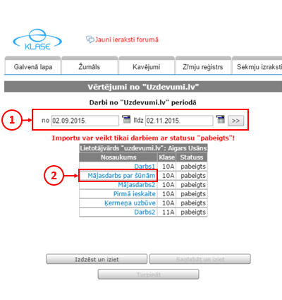 Jāizvēlas sev interesējošais periods (1) un mājasdarbs, kura rezultātus nepieciešams pārnest uz E-klasi (2). Jāņem vērā, ka izvēlēties varēs tikai tos pārbaudes darbus, kuri ir pabeigti vai kuru izpildes laiks ir beidzies.