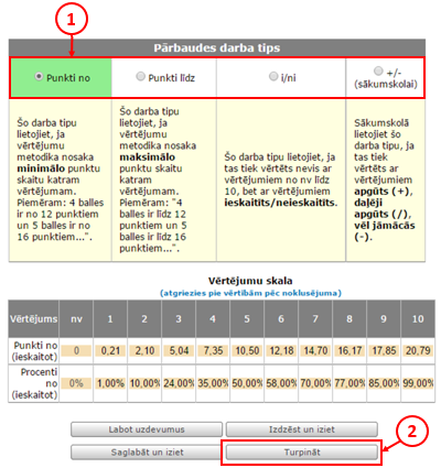 Šajā solī jāizvēlas pārbaudes darba tips - vērtējums ballēs vai vērtējums "i/ni" (1). Tālāk jāklikšķina uz pogas "Turpināt".
