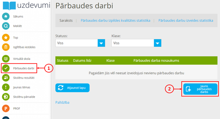 Uzsākt pārbaudes darbu veidošanu iespējams, uzklikšķinot uz sadaļas "Pārbaudes darbi" (1) lapas kreisajā izvēlņu joslā un pēc tam izvēloties iespēju "Jauns pārbaudes darbs" (2) lapas labajā apakšējā stūrī.