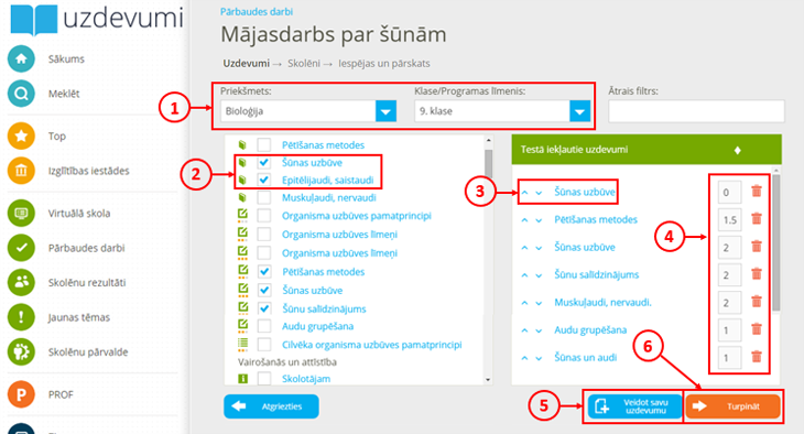 Šajā solī iespējams izvēlēties uzdevumus, kurus iekļaut pārbaudes darbā. Izvēloties priekšmetu un klasi (1), kreisajā pusē parādīsies pieejamie teorijas materiāli, uzdevumi un testi, kurus var iekļaut pārbaudes darbā. Pirms uzdevuma ievietošanas pārbaudes darbā, to iespējams apskatīt un pārbaudīt tā variācijas, uzklikšķinot uz uzdevuma nosaukuma (2).