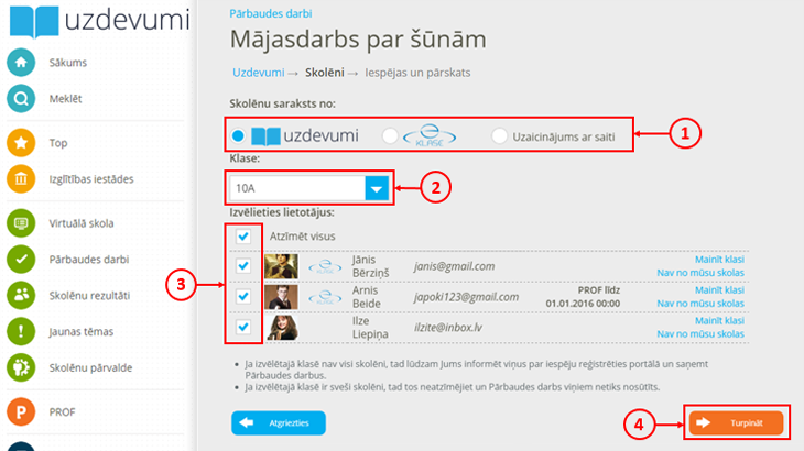 - Uzdevumi.lv saraksta - jāizvēlas vajadzīgā klase (2), jāatzīmē skolēni, kuriem tiks izsūtīts darbs (3), un jāklikšķina "Turpināt" (4). Ja izvēlētajā klasē nav visu skolēnu, tad lūdzam informēt viņus par iespēju reģistrēties portālā un saņemt pārbaudes darbus. Ja izvēlētajā klasē ir sveši skolēni, tad tos neatzīmējiet un pārbaudes darbs viņiem netiks nosūtīts.