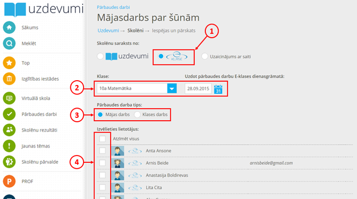 - E-klases saraksta - šī iespēja ir pieejama tikai tad, ja skolotājs ir savienojis savu Uzdevumi.lv profilu ar E-klases profilu. Skolēnu saraksta izvēlnē jāieklikšķina pie E-klases logo (1), tālāk jāizvēlas vajadzīgā klase un jānorāda datums, kurā pārbaudes darbs parādīsies skolēna E-klases dienasgrāmatā (2). Turpinājumā jāatzīmē pārbaudes darba tipu (3) un jāieliek ķeksīti pie tiem skolēniem, kuriem šis darbs tiks nosūtīts (4). Tālāk jāklikšķina uz pogas "Turpināt" un jāseko norādījumiem.