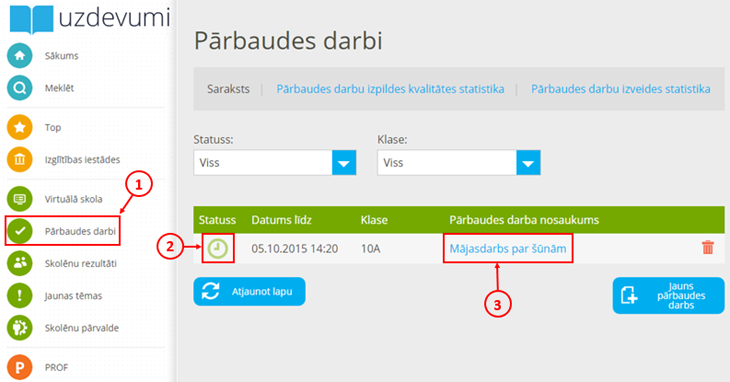 Pēc darba nosūtīšanas to iespējams atrast sadaļā "Pārbaudes darbi" (1), kur būs redzams darba statuss (2), izpildes termiņš un nosaukums (3).