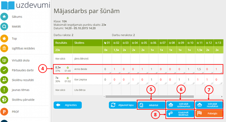Ja šādu pašu darbu skolotājs vēlas uzdot, piemēram, paralēlklasei, nav jāveido jauns darbs, bet gan jāklikšķina uz pogas "Atkārtot" (5), kur tiks dota iespēja izvēlēties citu skolēnu sarakstu, kam nosūtīt šo pašu darbu. Tāpat ir iespēja izdrukāt uzdevumus (6) un skolēnu rezultātus (7). Ja ir nepieciešams uzdot izveidoto pārbaudes darbu kādam skolēnam, kas nav bijis pirmajā sarakstā, jāklikšķina uz pogas "Uzaicināt skolēnus" (8) un tiks izveidota saite uz pārbaudes darbu, kas tālāk jānodod skolēnam. Savukārt, noklikšķinot uz pogas "Pabeigts", pārbaudes darbs skolēniem parādīsies kā noslēgts un vairs nebūs pieejams.