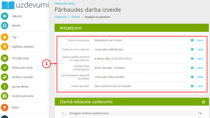 Iesatījumu sadaļā ir iespēja izveidot pārbaudes darba nosaukums un aprakstu (1), kā arī noteikt darba izpildes termiņu, sākuma un beigu datumus. Ja nepieciešams, pārbaudes darbam iespējams norādīt konkrētu izpildes laiku, kurā skolēnam ir jāiekļaujas (piemēram, 45 minūtes), citādi līdz izpildes termiņa beigām skolēns darbu varēs pildīt, cik ilgi vēlēsies. Tāpat šajā solī var izvēlēties iespēju, ka skolēns redz savu rezultātu uzreiz pēc darba pabeigšanas vai tikai pēc tam, kad skolotājs būs to pārbaudījis.
