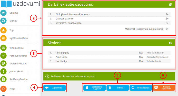 - nosūtīt pārbaudes darbu skolēniem (6).
