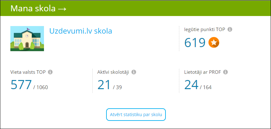 Lai atvērtu pilnu statistiku par skolu, klikšķiet uz logrīka nosaukuma "Mana skola" vai uz pogas "Atvērt statistiku par skolu".
