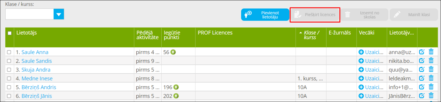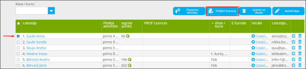 - Pretī viņa vārdam tabulas kreisajā malā jāatzīmē ķeksītis (vienlaicīgi iespējams atzīmēt vairākus lietotājus, kam piešķirt PROF licenci)