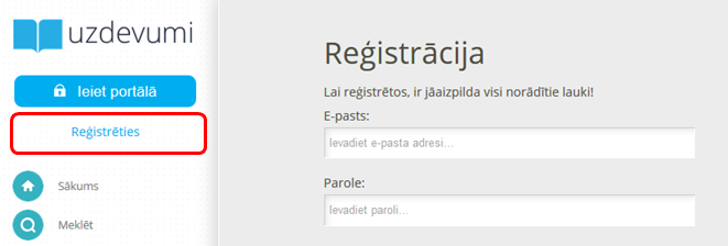 Ja Jūsu bērnam nav profils mūsu portālā, reģistrēties var dažos īsos soļos, klikšķinot uz sadaļas "Reģistrēties". Lai reģistrētos, aizpildiet visus norādītos laukus. Pēc informācijas aizpildīšanas, uz bērna e-pastu pienāks vēstule, kur jāapstiprina reģistrācija.