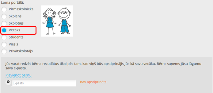 Pēc piereģistrēšanās bērnu var pievienot arī sadaļā ''Labot profilu''.