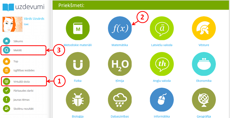 Lai apskatītu kāda priekšmeta saturu, jāklikšķina uz tā ikonas vai nosaukuma (piemēram, klikšķināt uz “Matemātika”).