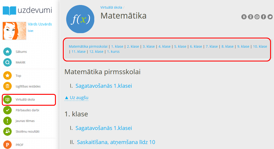 Atverot priekšmetu, redzams klašu izvēles saraksts. Klikšķinot uz kādu no klasēm, šajā pašā lapā parādīsies tēmu saraksts atbilstošajai klasei.