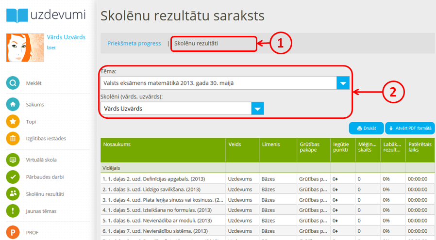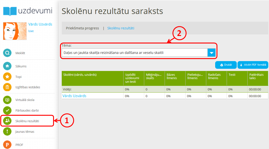 - Apakšsadaļā ''Priekšmeta progress'' redzams kopējais rezultāts par kādu noteiktu tēmu, bet sadaļā ''Skolēnu rezultāti'' būs redzama detalizēta informācija par katra uzdevuma izpildi - cik reizes izpildīts, cik ilgi, cik punkti nopelnīti u.c.