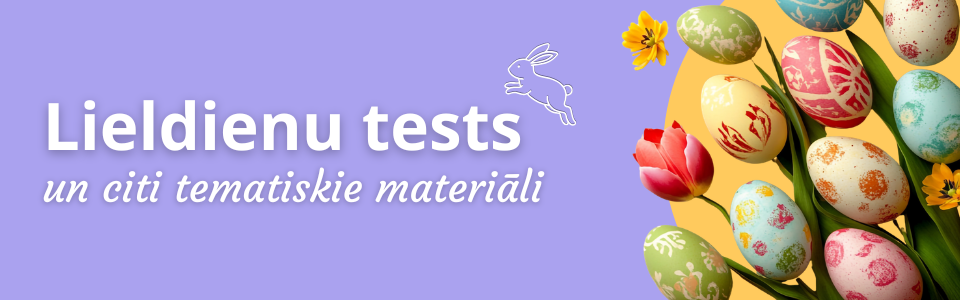 Jaunums! Tests par Lieldienu ticējumiemInteresants veids, kā vari iepazīt dažādus Lieldienu ticējumus par šūpošanos, olām, laikapstākļiem un citiem tematiem. |