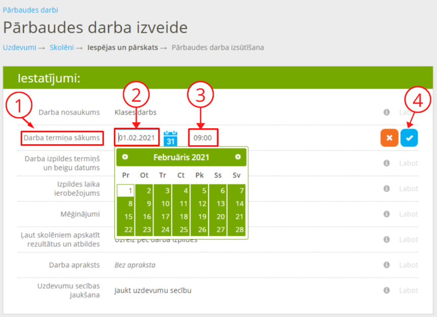 Arī stundu plānošanai un organizēšanai ir būtiska nozīme. Skolēni jutīsies drošāki un pārliecinātāki, ja iepriekš būs zināmas stundu norises un apgūstamās mācību tēmas. Lai Jums kā skolotājam būtu iespēja jau laicīgi saplānot skolēniem uzdodamos darbus, sadaļas “Pārbaudes darbi” iestatījumos varat norādīt darba termiņa sākumu - Jūs varat padarīt darbu pieejamu skolēniem uzreiz pēc publicēšanas vai arī uzstādīt Jums nepieciešamo laiku, kad darbu padarīt pieejamu skolēniem.