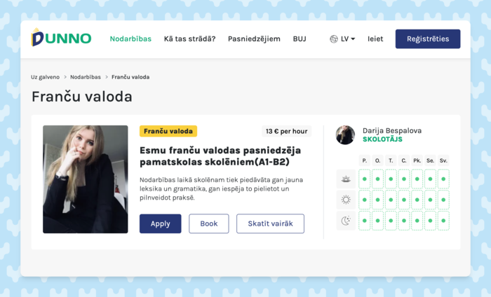 Dunno.lv 15. oktobrī uzsāks kampaņu, kas paredzēta vecākiem un dažāda vecuma potenciālajiem audzēkņiem, lai popularizētu gan jauno platformu, gan pasniedzēju piedāvājumu. Tāpēc svarīgi, ka pasniedzēji ne tikai reģistrējas, bet arī izveido un publicē savus piedāvājumus. Lai sāktu, pēc reģistrācijas Dunno.lv kā skolotājam, būs nepieciešami: