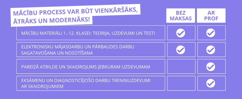 Uzdevumi.lv ir lielisks palīgs mācību procesā gan skolēniem un viņu vecākiem, gan skolotājiem. Izvēloties PROF maksas pakalpojumu, uzdevumu sagatavošana un pārbaudes darbu labošana kļūst vēl ātrāka un ērtāka! Tāpat arī skolēnu zināšanu pārbaude pirms noslēguma testiem kļūst vieglāka, jo skolotājiem ir pieeja papildus materiāliem. Ar “PROF” Jūs iegūstat: