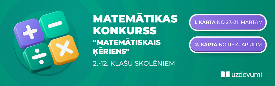Uzdevumi.lv organizē tiešsaistes konkursu 2.-12. klašu skolēniem matemātikā “Matemātiskais ķēriens”, kurā aicināts piedalīties ikviens Latvijas skolēns. Lai piedalītos konkursā, nav nepieciešamas speciālas prasmes - tā būs lieliska iespēja pārbaudīt skolēnu zināšanas un iegūt vērtīgas balvas.