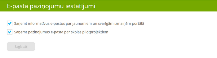 - Sadaļā e-pasta paziņojumu iestatījumi, atzīmējiet “Saņemt informatīvus e-pastus par jaunumiem un svarīgām izmaiņām portālā”.