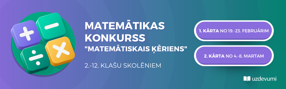 Jau trešo gadu norisināsies Uzdevumi.lv tiešsaistes konkurss 2.-12. klašu skolēniem “Matemātiskais ķēriens”. Tajā aicināts piedalīties ikviens Latvijas skolēns neatkarīgi no zināšanu līmeņa - tā būs lieliska iespēja pārbaudīt skolēnu zināšanas un iegūt vērtīgas balvas.