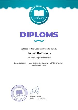 Izmantojiet iespēju semestra noslēgumā uzslavēt aktīvākos skolēnus ar personalizētu Uzdevumi.lv diplomu! Šis ir lielisks veids, kā pateikties par viņu ieguldīto darbu, aktivitāti un centību mācībās.