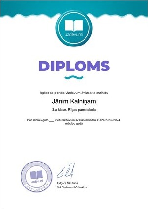 Tuvojoties 2023./2024. mācību gada izskaņai, esam sagatavojuši īpašu Uzdevumi.lv diplomu Jūsu aktīvākajiem skolēniem. Diplomu varat izdrukāt un pasniegt bērniem klātienē vai nosūtīt elektroniski e-pastā, E-klasē vai Mykoob, WhatsApp vai citā saziņas platformā.