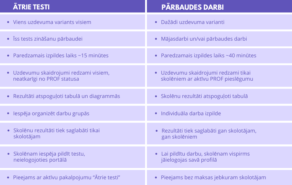 Kā atšķiras "Ātro testu" un "Pārbaudes darbu" iespējas?