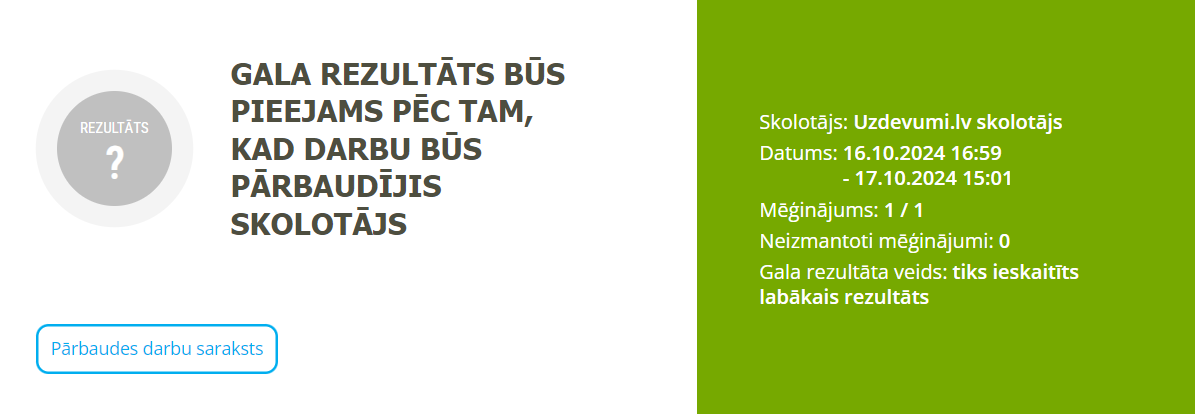 - Skolēns saņem rezultātu pēc tam, kad visi dalībnieki ir beiguši darbu