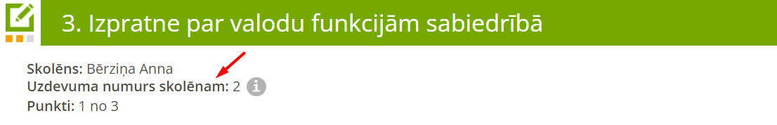 Pārbaudes darba rezultātu lapā uzdevumi tiks parādīti skolotāja norādītajā secībā. Ja darbam ir iespējota uzdevumu secības jaukšana, apskatot skolēna iesniegto atbildi, skolotājs redzēs, kādā pozīcijā konkrētais uzdevums bija redzams skolēnam.