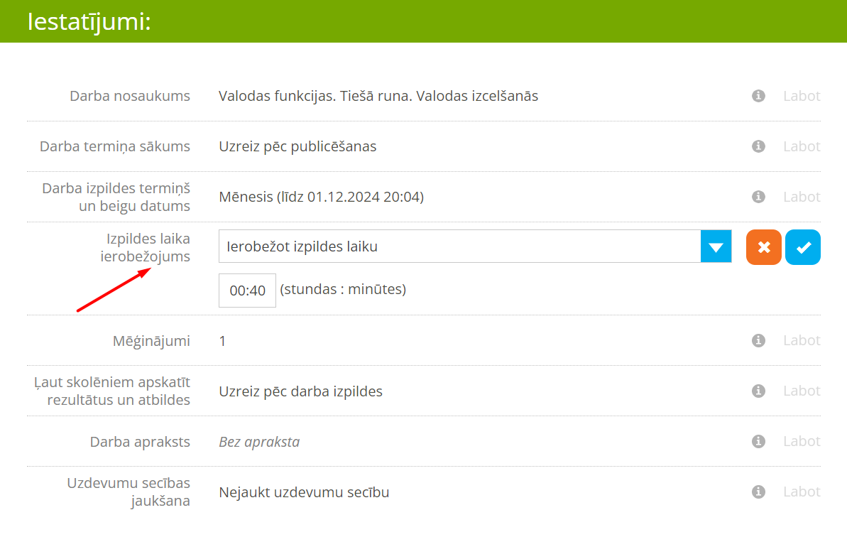 Izpildes laika ierobežojumu ir iespējams norādīt pārbaudes darba izveides solī “Iespējas un pārskats”.