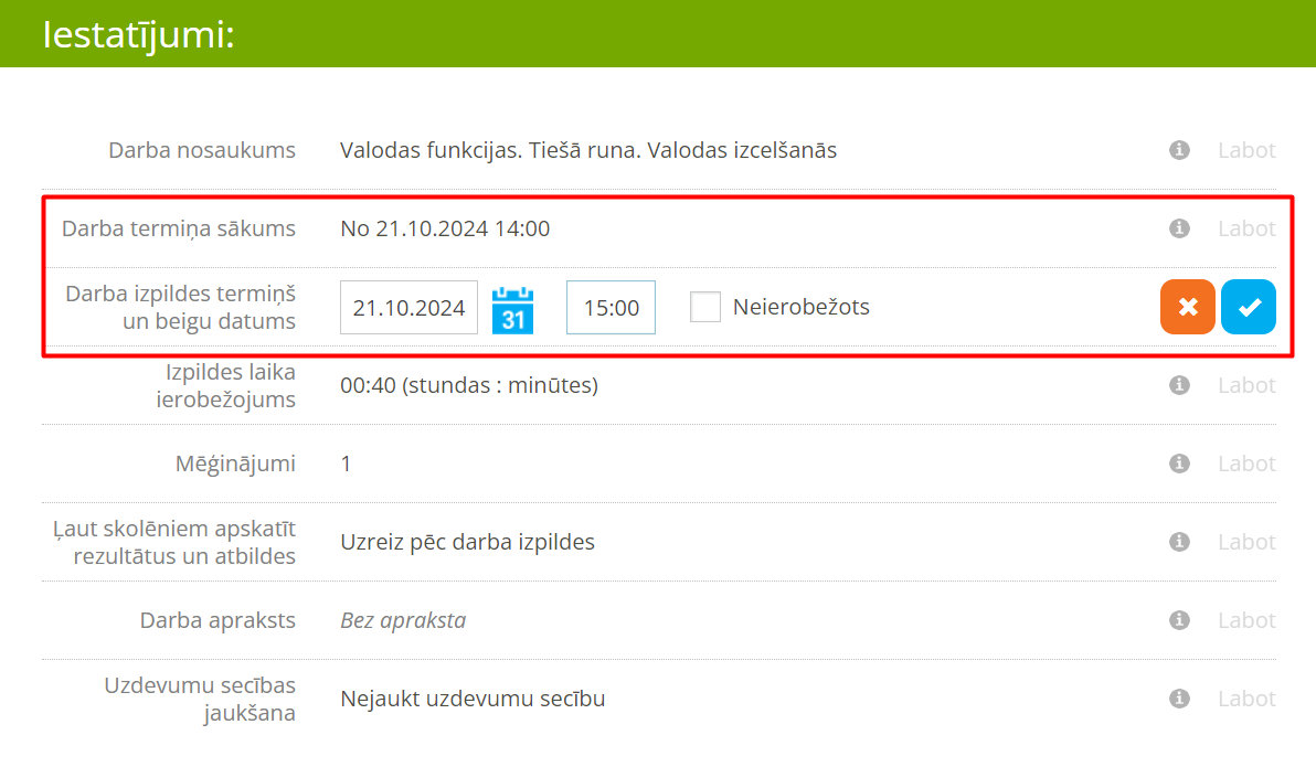 Pēc tam tajā pašā sadaļā “Iestatījumi” pretī iespējai “Darba izpildes termiņš un beigu datums” jāklikšķina uz “Labot” un jānorāda datums un laiks, līdz kuram skolēni darbu varēs uzsākt pildīt.