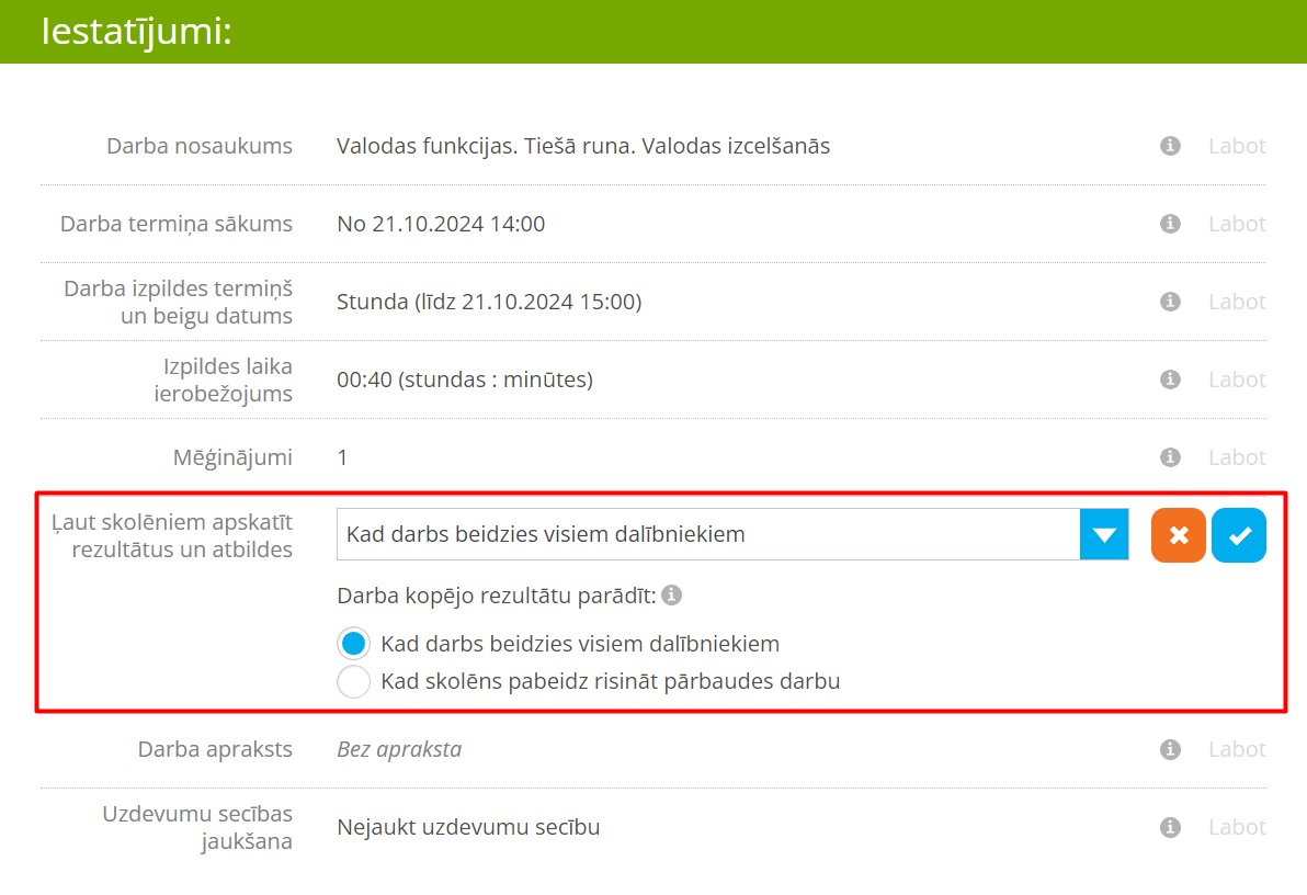 - Pēc tam ir iespēja norādīt, kad skolēni redzēs darba kopējo rezultātu (bez pareizajām atbildēm un risinājuma) - kad darbu beiguši visi dalībnieki vai kad skolēns pabeidz risināt pārbaudes darbu