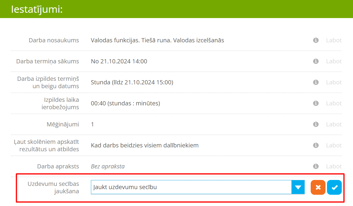 - Sadaļā “Iestatījumi” pretī iespējai “Uzdevumu secības jaukšana” jāklikšķina uz “Labot”