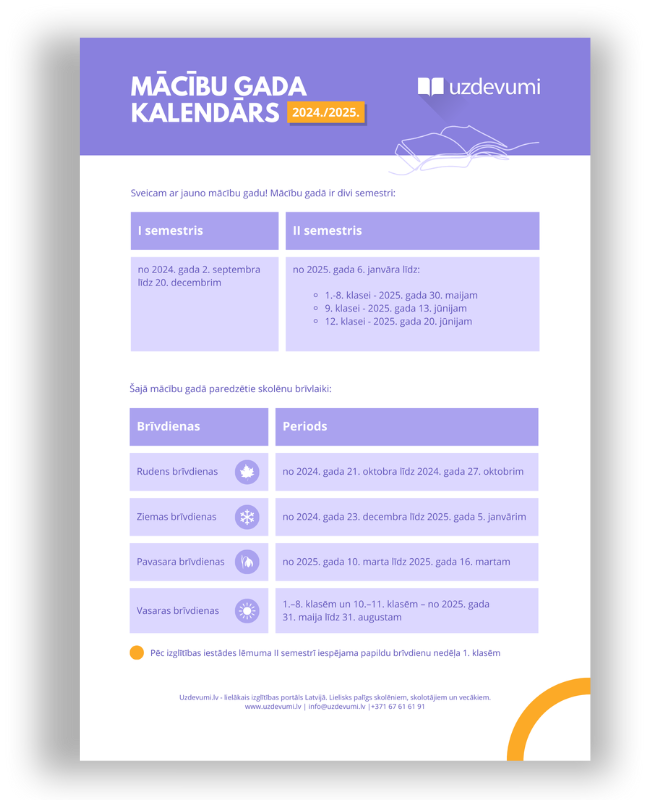 Piedāvājam lejupielādēt failu ar 2024./2025. mācību gada laikiem, ko izvietot klases telpā vai nosūtīt skolēniem.