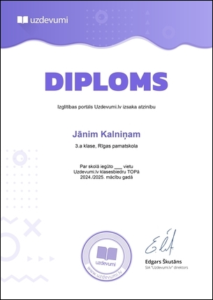 Šis ir vienkāršs un efektīvs veids, kā novērtēt viņu sasniegumus, iedrošināt mācīties ar prieku un stiprināt pārliecību par saviem spēkiem. Diplomu varat izdrukāt un pasniegt bērniem klātienē vai nosūtīt elektroniski E-klasē, Mykoob vai citā saziņas platformā.