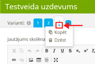 - Klikšķiniet uz trijstūra ikonas zem varianta numura, lai kopētu vai dzēstu atvērto variantu. Kopējot tiks dublēts izvēlētā uzdevuma saturs.