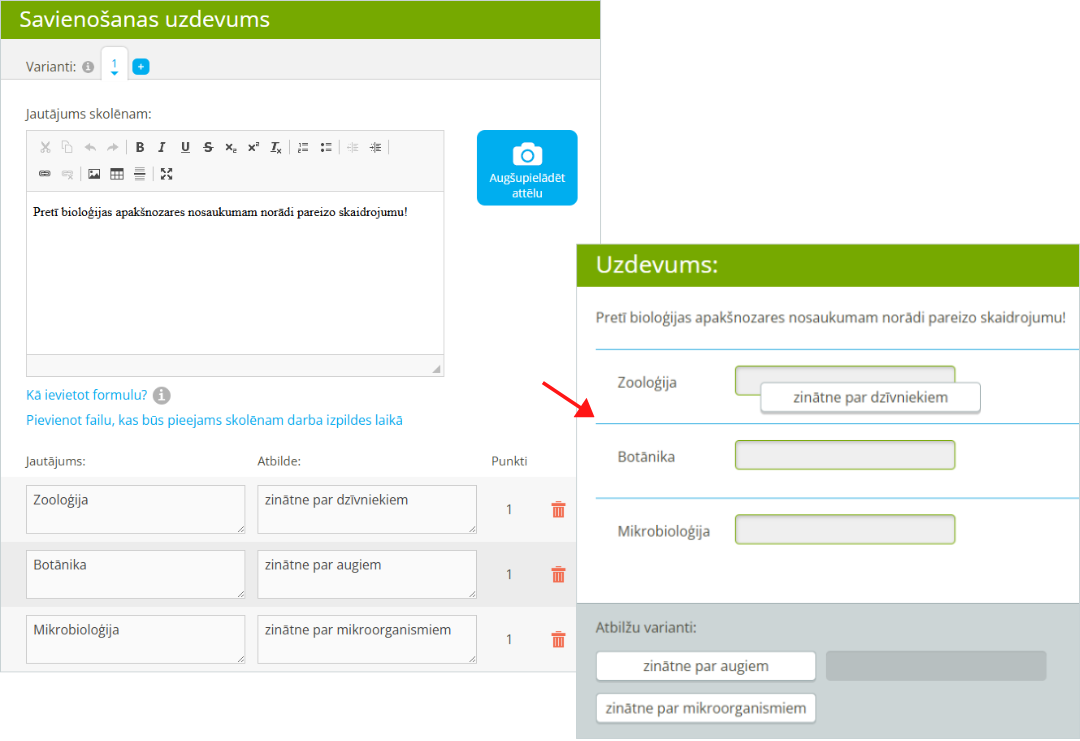 Uzdevuma veidošana ir vienkārša: Jūs norādāt uzdevuma nosacījumu (piemēram, “Savieno jēdzienu ar tā definīciju!” vai “Atrodi pareizo atbildi uz jautājumu!”), tad kolonnā “Jautājums” ievadāt jautājumus, terminus vai definīcijas, bet kolonnā “Atbilde” - tiem atbilstošās atbildes. Savukārt skolēns savā profilā redzēs statisku kolonnu “Jautājums” un ar pārvilkšanas funkciju no vārdu bankas varēs ievietot atbildes attiecīgajos lauciņos.