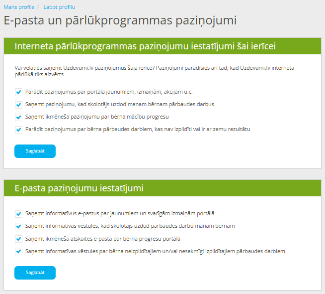 Paziņojumu saņemšanas iestatījumus varat mainīt jebkurā laikā, ieejot sadaļā "Mans profils" > "Labot profilu" > "E-pasta un pārlūkprogrammas paziņojumi”.