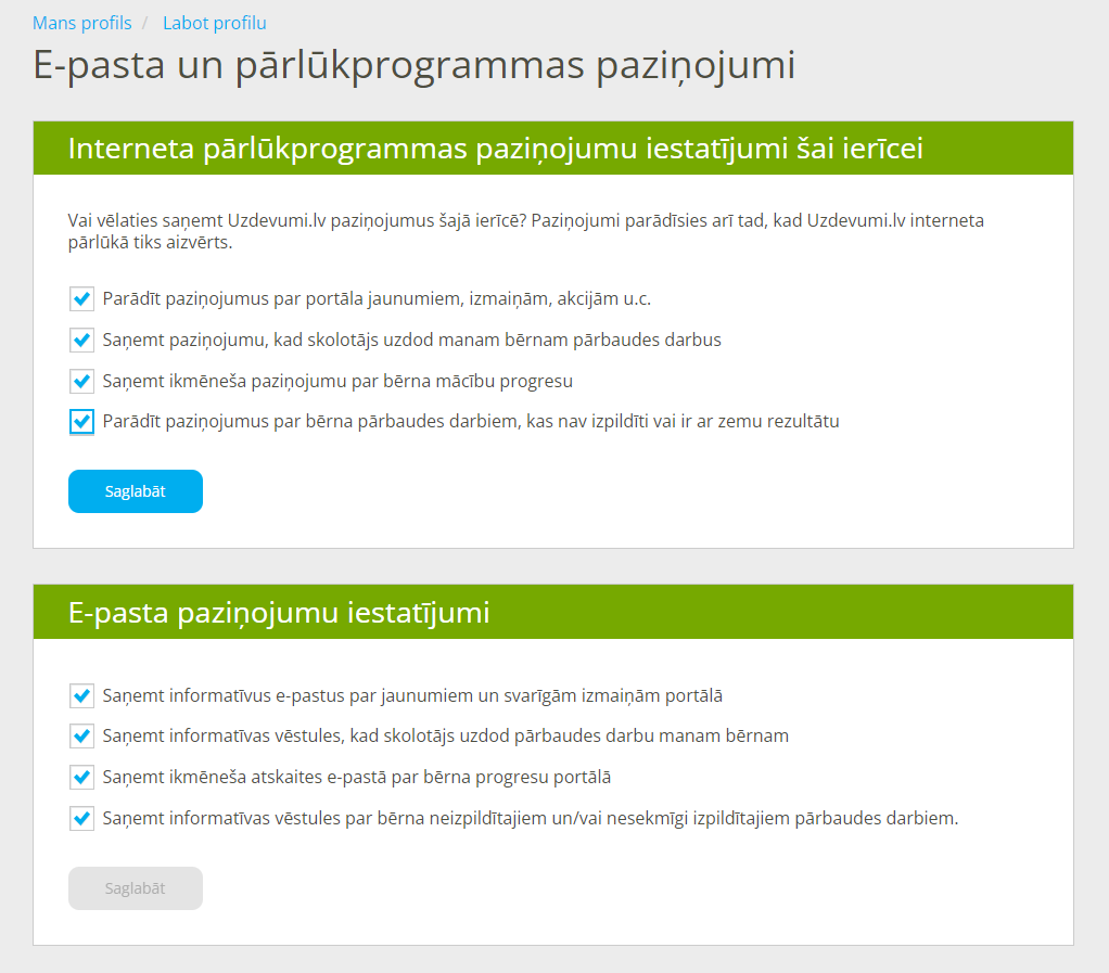 Lai saņemtu paziņojumus par bērnam uzdotajiem mājasdarbiem vai nesekmīgi nokārtotajiem pārbaudes darbiem, Jūsu vecāka profilā jābūt atzīmētam, ka piekrītat saņemt dažāda veida informāciju par bērna mācību rezultātiem. Informāciju varat saņemt divos veidos - interneta pārlūkprogrammā un savā e-pastā.