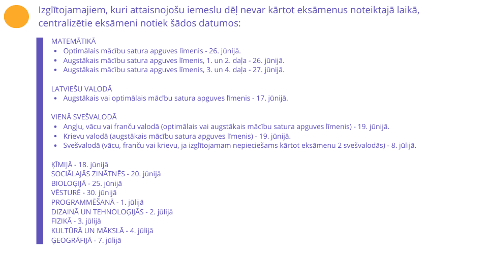 Plašāka informācija par centralizētajiem eksāmeniem atrodama Ministru kabineta noteikumos Nr. 695 "Noteikumi par valsts pārbaudes darbu norises laiku 2024./2025. mācību gadā". Informācija sagatavota 2025. gada 10. aprīlī.