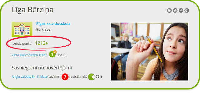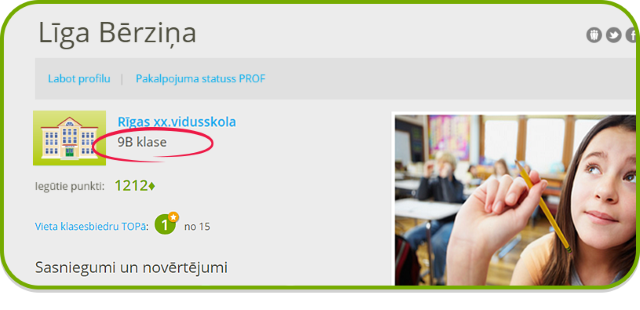 Katrs skolēns taču grib parādīt saviem klasesbiedriem un skolasbiedriem, cik zinošs viņš ir, vai ne? Esi pirmais klases topā, pildot uzdevumus un testus Virtuālajā skolā, krāj punktus un uzturi veselīgu konkurenci ar klasesbiedriem un citiem Uzdevumi.lv lietotājiem! Svarīgi, ka skolēna publiskajā profilā redzami VISI viņa iegūtie punkti, bet klases profilā - tikai tie punkti, ko skolēns ieguvis, pildot savas klases uzdevumus. Piemēram, ja skolēns mācās 9.klasē, tad klases topā parādīsies saņemtie punkti par 9.klases uzdevumiem, taču neparādīsies tie punkti, kurus skolēns būs ieguvis, pildot, piemēram, 5.klases uzdevumus.
