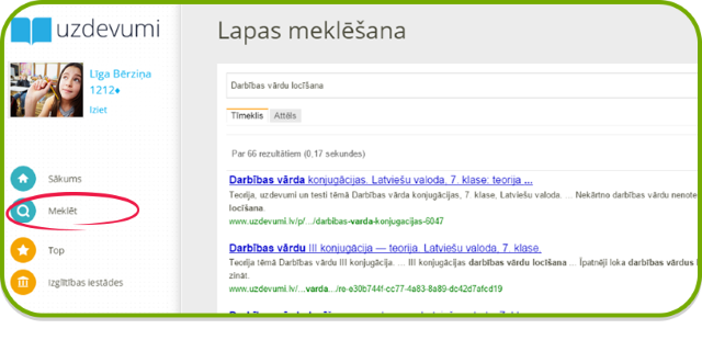 Reizēm gadās, ka pie savas klases nevari atrast sev interesējošo tēmu vai arī gribi patrenēties kādā tēmā, kas neatbilst Tavai klasei un nezini, kur to meklēt. Neuztraucies! Ja vēlies atrast konkrētu sadaļu, izmanto portāla meklētāju, kuru atradīsi lapas kreisajā izvēlņu sarakstā. Ieraksti meklētājā tēmas nosaukumu (piemēram, "darbības vārdu locīšana") un atradīsi visu Uzdevumi.lv saturu, kas saistīts ar Tevis izvēlētajiem atslēgas vārdiem.