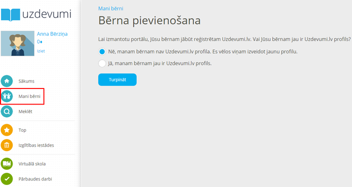 Jaunajā sadaļā iespējams pievienot savam vecāka profilam bērna profilu, kā arī sekot līdzi viņu rezultātiem. Lai piekļūtu sadaļai "Mani bērni", Jums jāreģistrējas Uzdevumi.lv ar lomu "Vecāks" vai jāielogojas savā vecāka Uzdevumi.lv profilā un kreisajā izvēlņu joslā jāklikšķina uz otrās sadaļas.