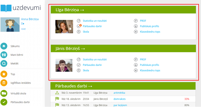 Vēl viens jauninājums, kas atvieglos Jūsu Uzdevumi.lv izmantošanu - profilam pievienotie bērni un viņu vizītkarte būs redzama jau sākumlapā, tādējādi Jūs ātri un ērti varat piekļūt sev nepieciešamajai informācijai par katru bērnu.
