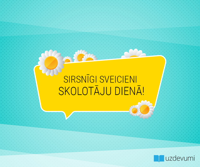 Sūtām Jums virtuālus sveicienus, ziedu pušķus un bučas Skolotāju dienā! Tieši Jūsu neatlaidīgais un pašaizliedzīgais darbs ir tas, kas iededz un vairo zinātkāres dzirksteli jauniešu acīs. Paldies, skolotāj, par Jūsu nenovērtējamo ieguldījumu Latvijas nākotnē! Novēlam Jums izturību, spožus skolēnus un neskaitāmus lepnuma un gandarījuma piepildītus brīžus par savu audzēkņu sasniegumiem!
