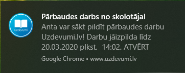 Interneta pārlūkprogrammas paziņojumos vecāks savā mobilajā ierīcē vari datorā saņems īsu un kodolīgu informāciju par to, ka bērnam ir uzdots pārbaudes darbs, kā arī atgādinājumus par darbiem, kas nav izpildīti un kam tuvojas izpildes termiņa beigas. Piesakoties paziņojumiem datorā vai mobilajā ierīcē, tiks saņemtas, piemēram, šādas ziņas: